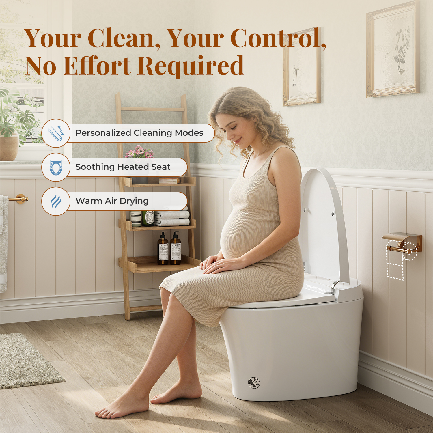 - Hygienic Bidet Toilet: Move beyond toilet paper with a built-in bidet featuring dedicated front and rear wash settings. With adjustable pressure and temperature, it provides a gentle cleaning experience that supports comfort during pregnancy, postpartum recovery, and for those with sensitive skin.