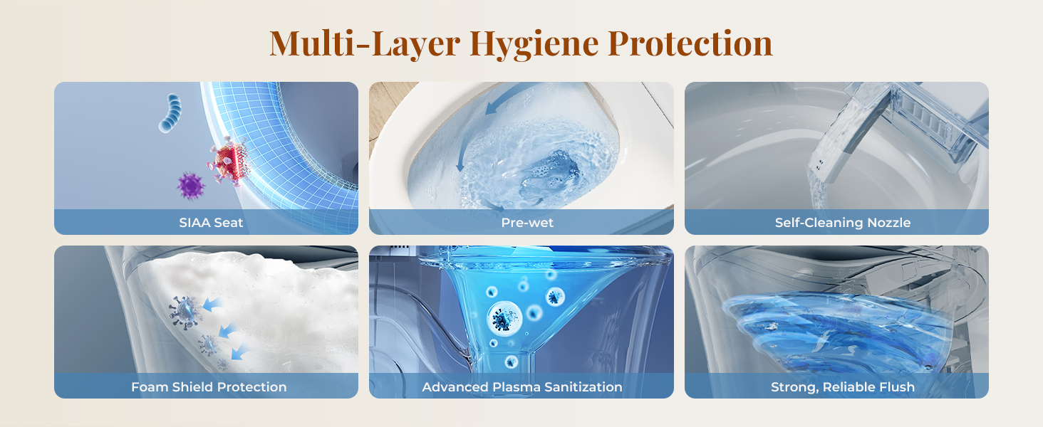 - Advanced Hygiene Smart Toilet: Dual-action hygiene system combines PlasmaClean Deodorization to neutralize odors at the source with an Anti-Splash Foam Shield that prevents water droplets and creates an odor-isolating barrier, ensuring a clean, hands-free bathroom experience. (The foaming solution needs to be purchased separately.)