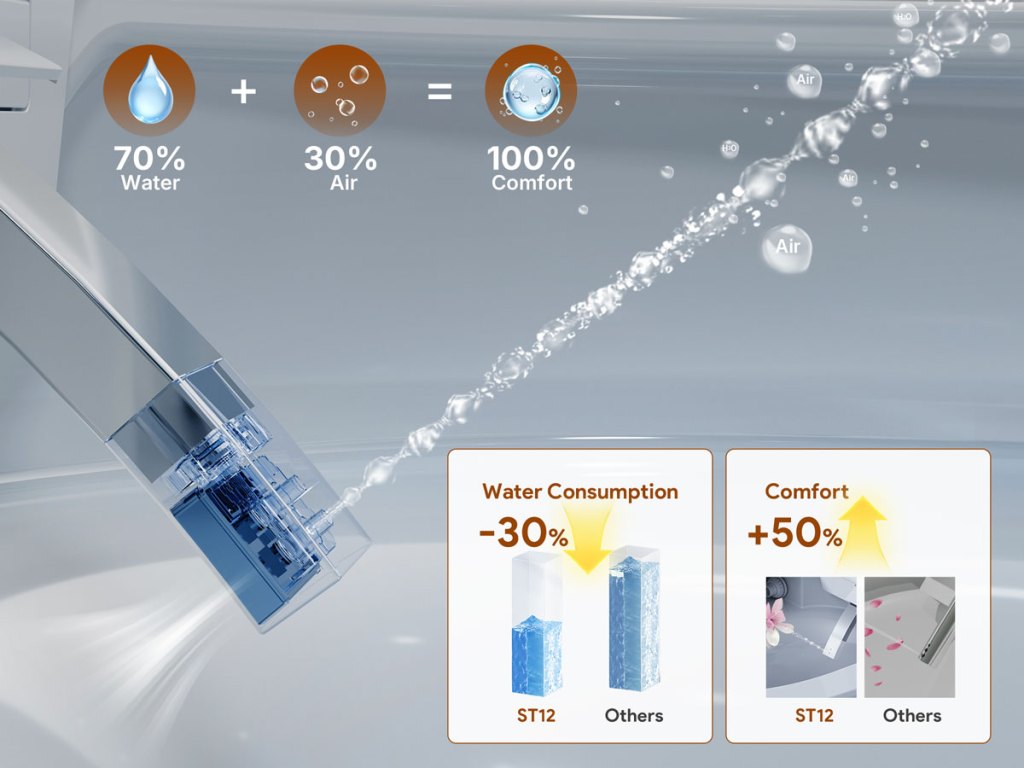 Unlike other powerful flush smart toilets with built-in pumps, the Uncle Brown ST12 incorporates the pump into the tank. Just as it’s difficult to hear someone talking underwater on land, water isolation significantly reduces the noise of the pump during flushing.